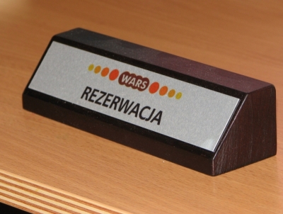 Identyfikator w postaci drewnianego podkładu z aluminiowym wykończeniem. Idealny do postawienia na biurku, w recepcji czy na stoliku.